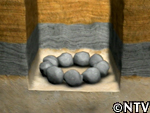 | そして、その外側には砂利を敷いて石をしっかり固定する。 この作業を繰り返して積み上げていくと、頑丈な石積みの井戸が出来上がる。 ところが、いざ石を積もうとすると、 達也「どこに石があるのか分かんねえな」 |